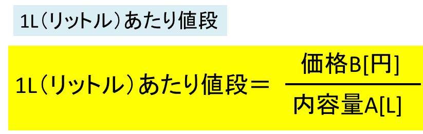 ある製品にて、内容量Xmlの製品の価格がY円であったとします。このとき、1ml(ミリリットル)あたり値段=価格Y÷内容量Xで解くことができるのです。