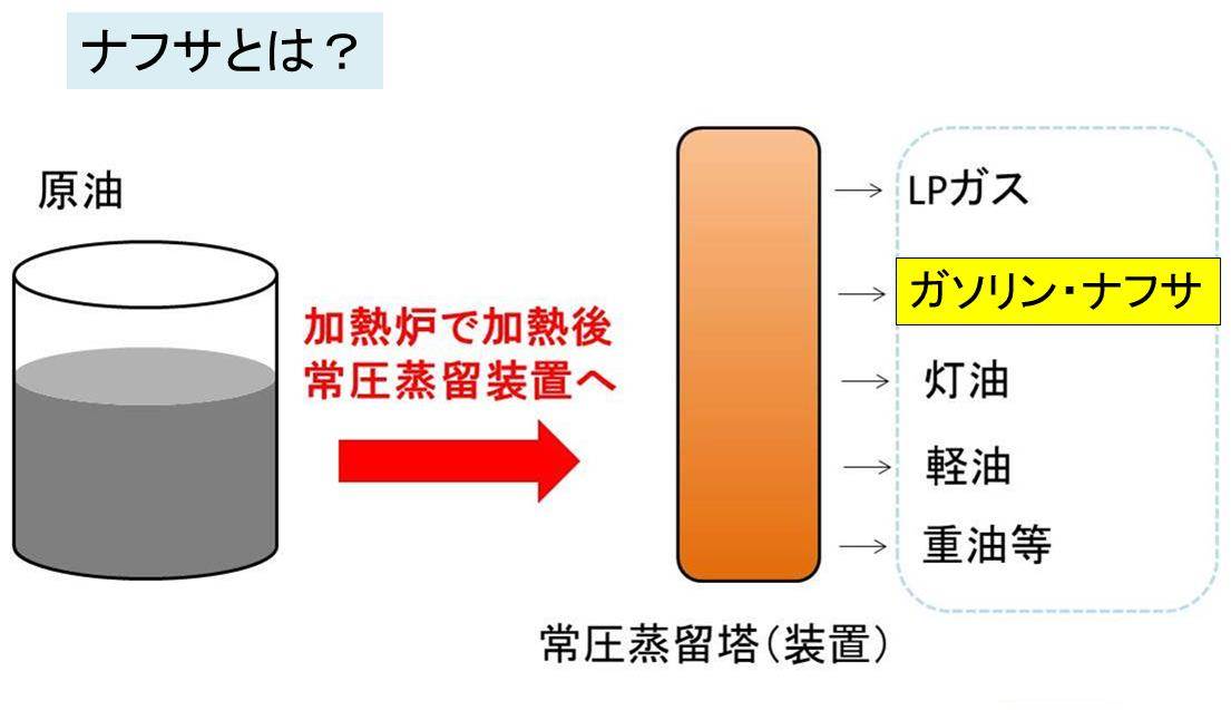 ナフサとは、簡単に言うと「ガソリン」「灯油」「軽油」などの総称の石油製品の中の一つといえます。