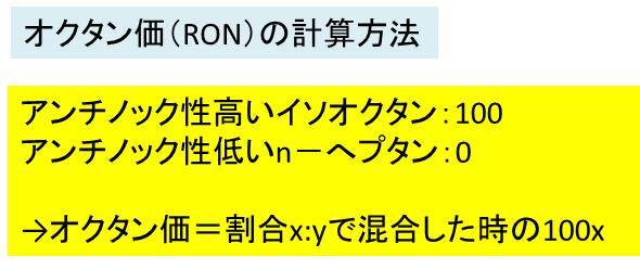 先にものべたようにアンチノック性が高い枝分かれがあるアルカンのイソオクタンを100とし、逆にアンチノック性が低いn-ヘプタン(直鎖アルカン)を0としたときの、その混合割合でオクタン価は決められます。