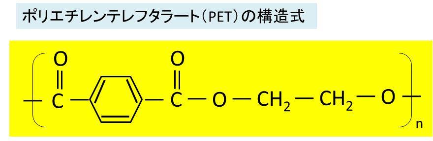 ペットボトルとしての材質で有名なPET(ポリエチレンテレフタラート)は以下のような化学構造をとります。