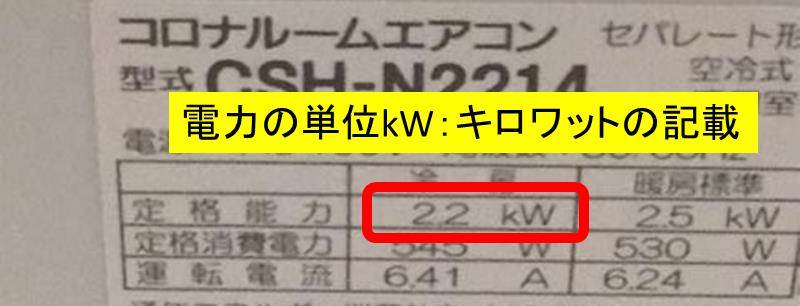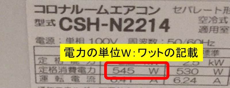実際の記載としては、エアコンの性能としてワットの表記を見かけます。以下のようなものです。