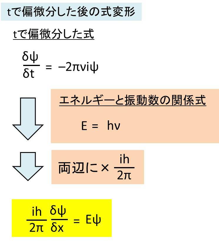 δψ/δt = -2πiψ/λ に対して、ν = E/hを代入し、両辺に×ih/2π を行うことで、ih/2π δψ/δt = E δψという式を導くことが出来ます。